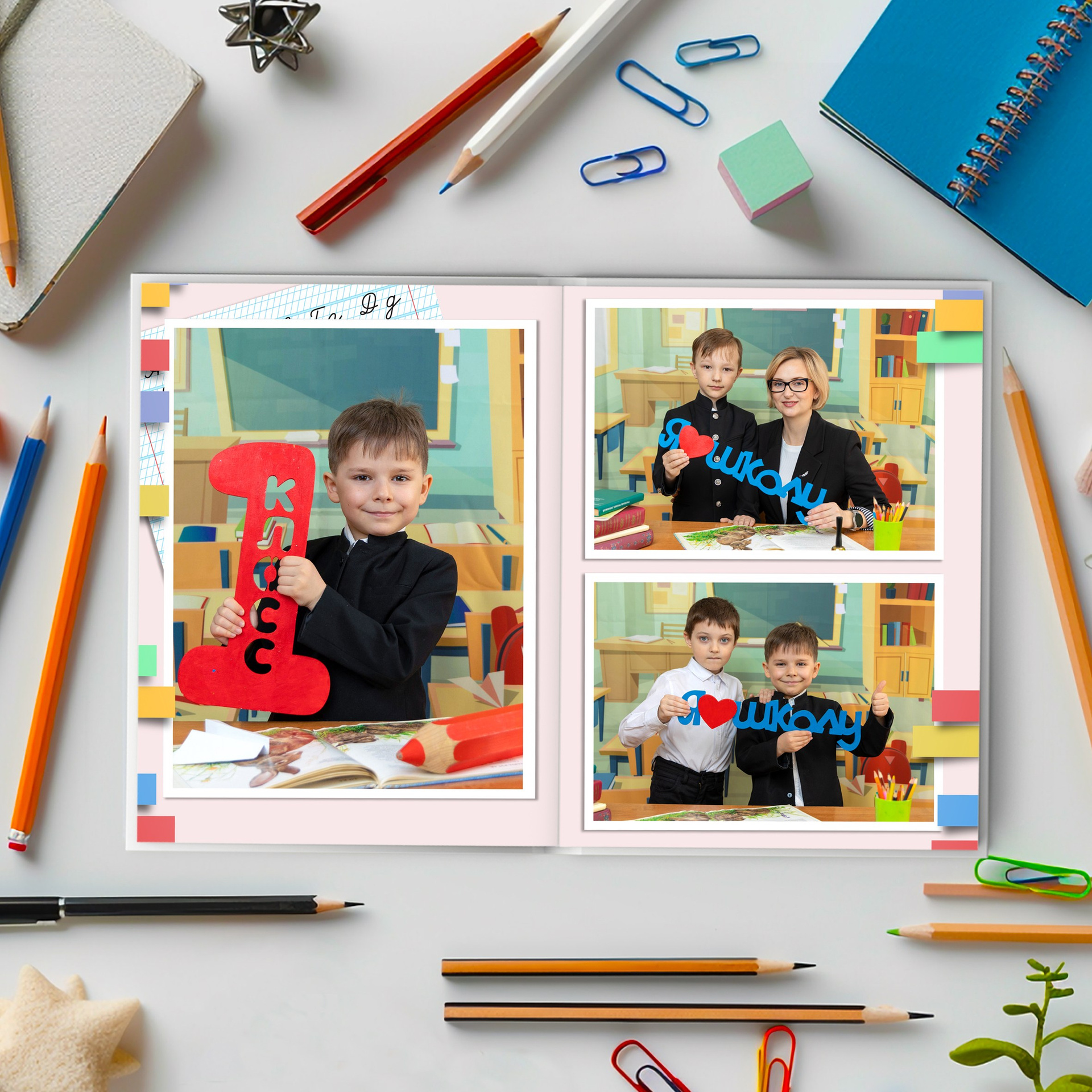 Папка в один разворот — 2000 руб + 2 фото (портреты для бабушек). Портреты ребенка. Фото с учителем — заранее договориться. И на обратной стороне общее фото. От 15 чел.
